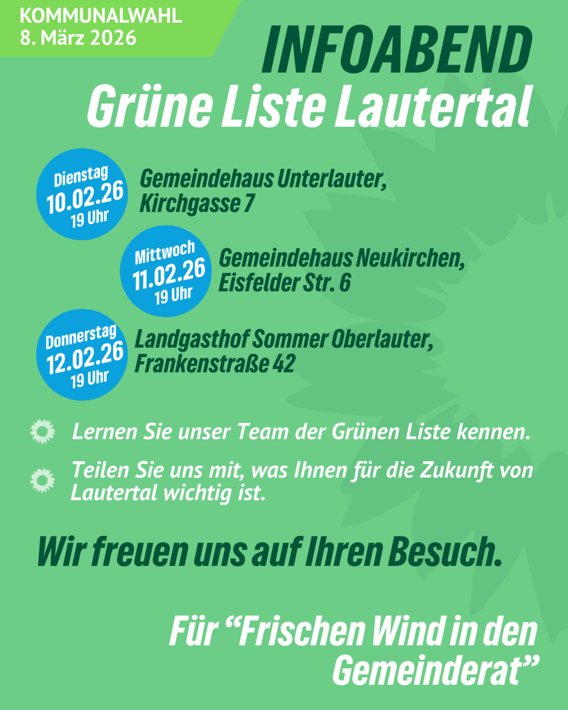 Da in der am Mittwoch erschienenen Ausgabe des gemeindlichen Amtsblatts die Uhrzeit der Informationsveranstaltungen der Offenen Grünen Liste Lautertal nicht abgedruckt war, wird an dieser Stelle noch einmal auf die Veranstaltungen hingewiesen.