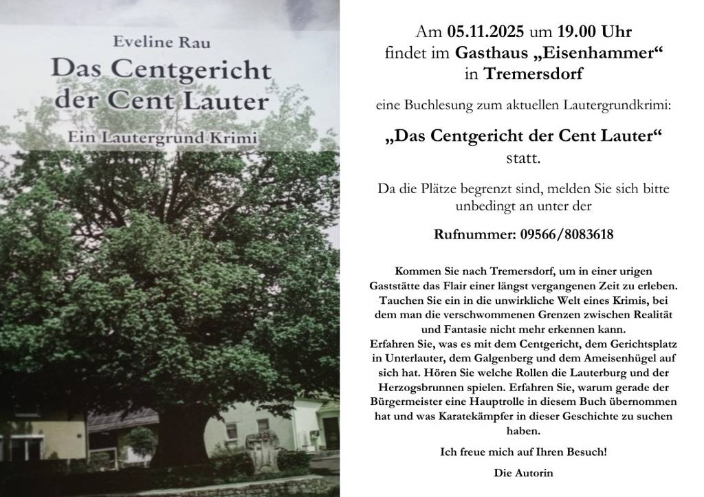 am 05.11.2025, um 19 Uhr, im Gasthaus "Eisenhammer" findet eine erneute Buchlesung der Autorin Eveline Rau statt.