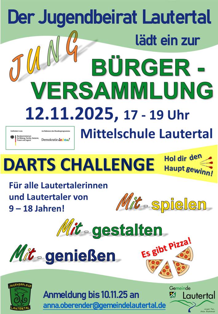Du bist zwischen 9 – 18 Jahren alt, wohnst in Lautertal und hast Ideen oder Wünsche, wie deine Gemeinde für dich besser werden kann? Super! Dann laden wir dich zusammen mit dem Jugendbeirat Lautertal recht herzlich ein, an unserer Jungbürgerversammlung teilzunehmen! Wir treffen uns am Mittwoch, den 12.11.25 von 17 – 19 Uhr an der Mittelschule Lautertal.
