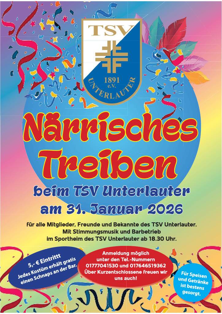 Auch 2026 heißt es wieder Helau, Alaaf & Idis Ahoi – der TSV Oberlauter lädt herzlich zu seinen traditionellen Faschingsveranstaltungen ins Sportheim ein.