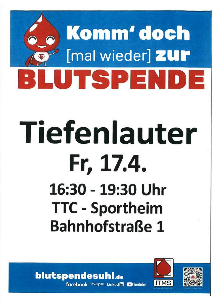 der nächste Blutspendetermin findet am Freitag, 17. April 2026 im TTC-Sportheim im Ortsteil Tiefenlauter statt.