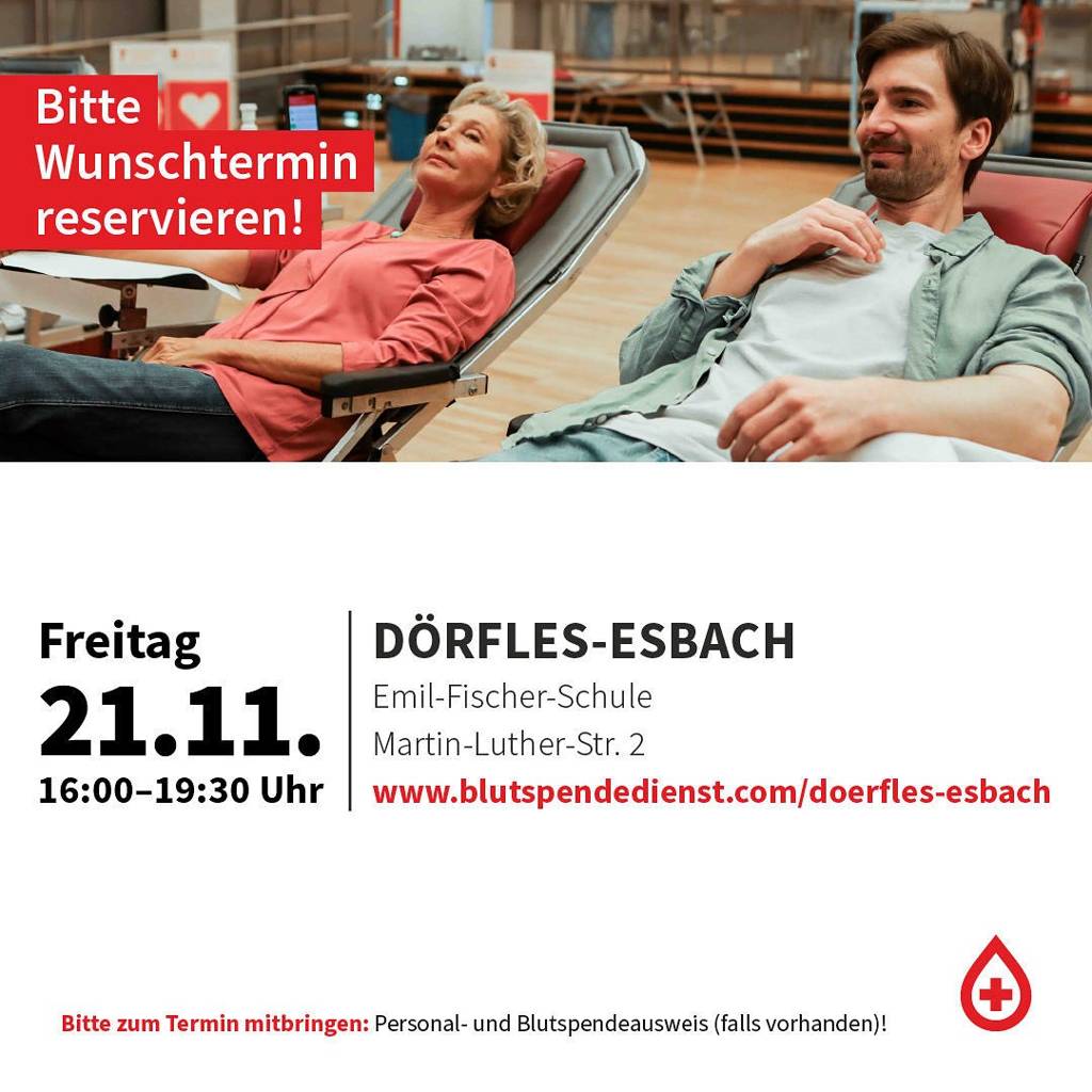 der nächste Blutspendetermin ist am 21.11.2025 in der Emil-Fischer-Grundschule in Dörfles-Esbach.