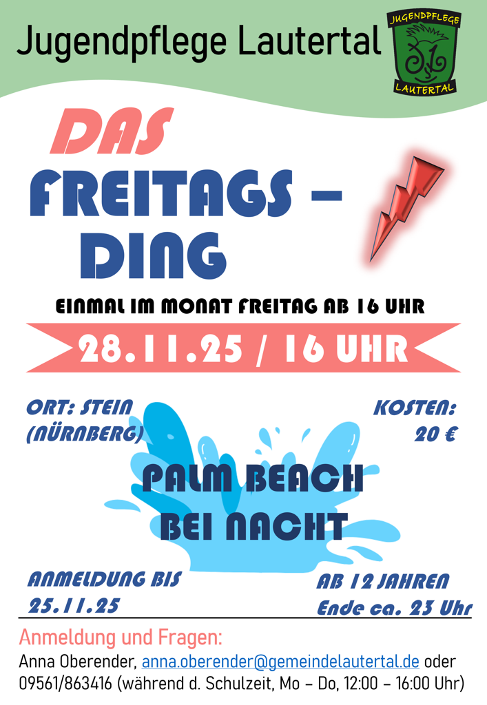 Wir laden wieder alle Lautertalerinnen und Lautertaler ab 12 Jahren herzlich dazu ein, sich mit uns am 28.11.25 in die Fluten des Palm Beach zu stürzen.
