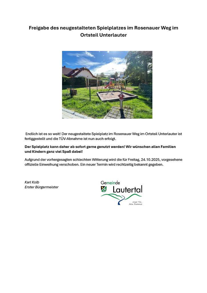 aufgrund der vorhergesagten schlechten Witterung wird die für Freitag, 24.10.2025, vorgesehene offizielle Einweihung des Spielplatzes im Rosenauer Weg im Ortsteil Unterlauter verschoben.